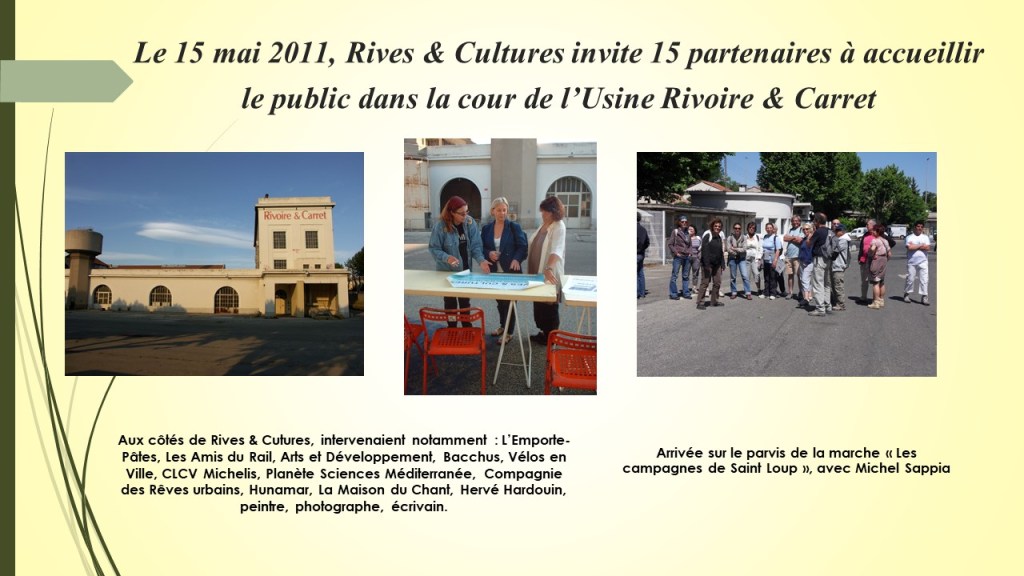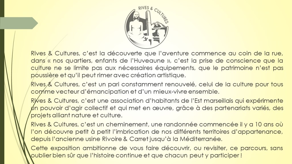 Créée en 2009, l’association Rives & Cultures anime la vie culturelle du territoire de la vallée de l’Huveaune avec le concours d’intervenants qualifiés, d’acteurs économiques, artistes, acteurs associatifs ou toute personne souhaitant s’investir dans un projet de développement local.