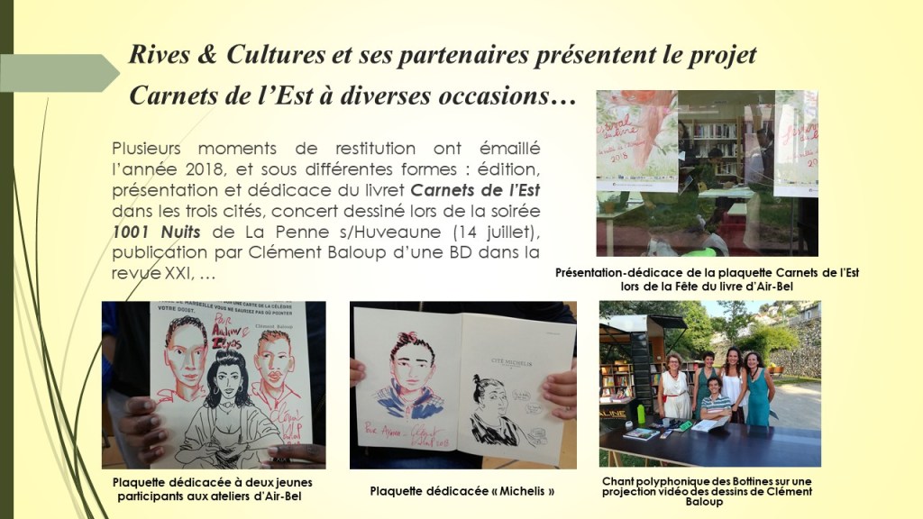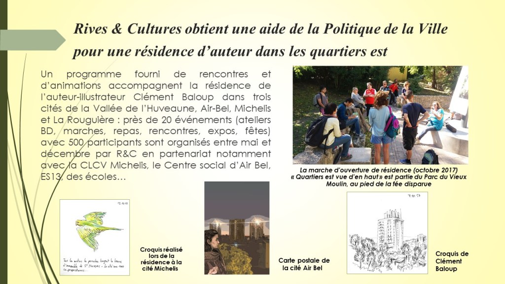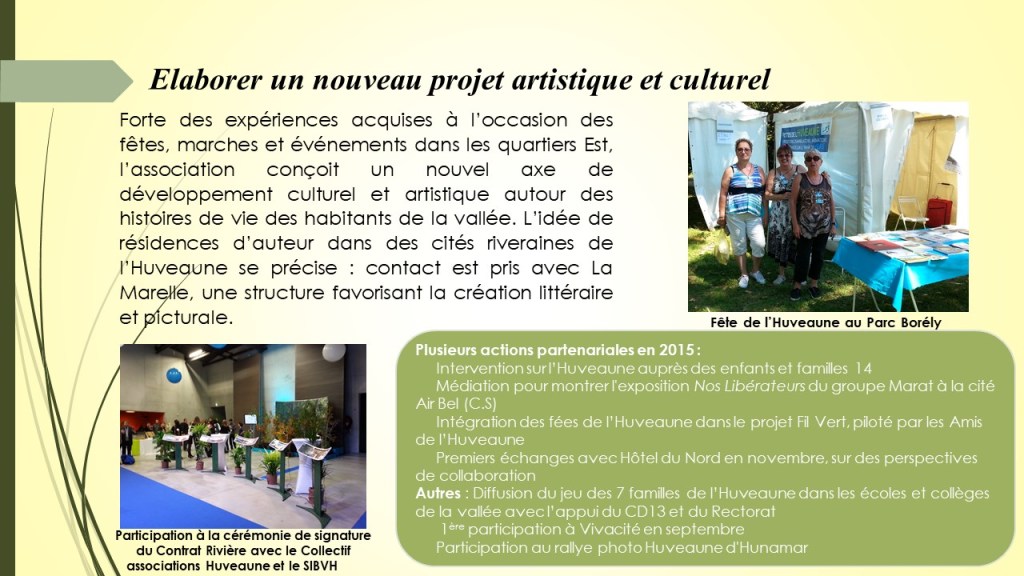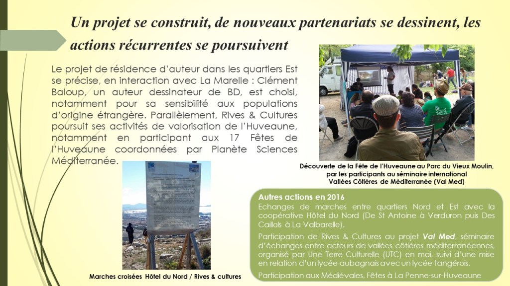 Enfin, Rives & Cultures participe activement au Collectif Associations Huveaune et s’engage résolument dans des partenariats au long cours avec d’autres acteurs de la Vallée : projets En Lisières avec Cultures Permanentes, Educalanques avec Cartes sur Table, projets ISEF de l’EPAGE HuCA, etc.