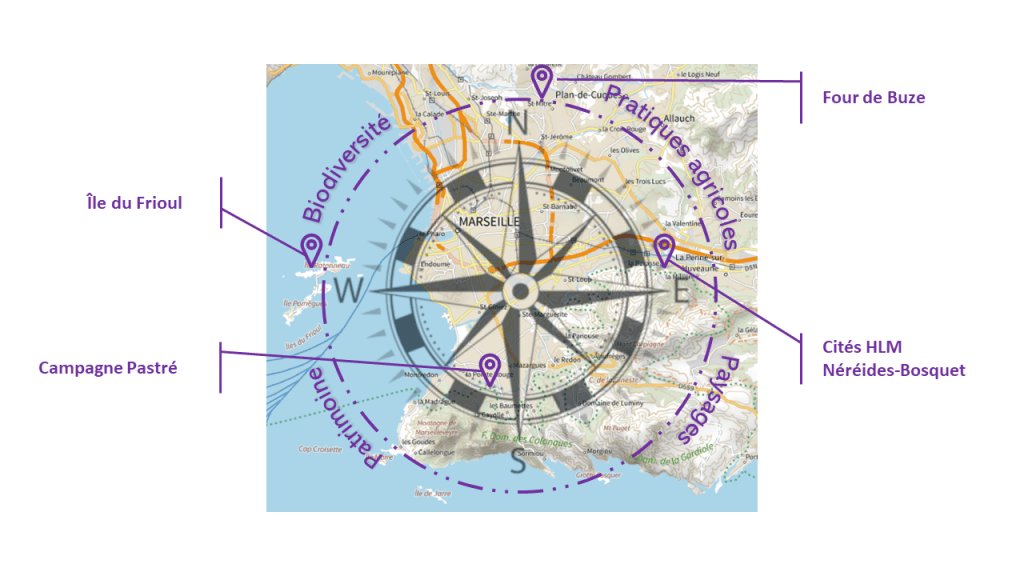 « Collines en ville » vise à valoriser les collines qui entourent Marseille et à relier les habitants de Marseille à ces milieux naturelsproches : découvrir leur biodiversité, leur richesse patrimoniale (histoire, paysages, pratiques agricoles, loisirs) et, aux quatre points cardinaux de la cité phocéenne, marquer ce lien à travers des sculptures-signal, avec l’appui de partenaires qui y sont déjà implantés.
