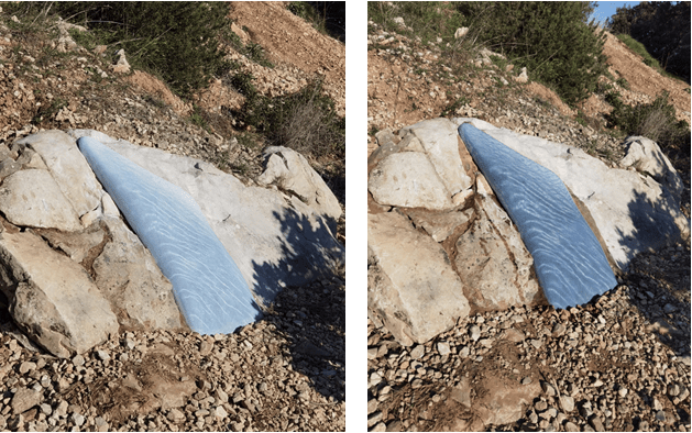 Poncée et dépolie, la roche revêt un voile bleuté; enchâssée entre deux blocs de calcaire, elle attend, prête pour sa métamorphose. Il suffit d’y apposer une main humide, répétant le premier geste créatif, ou d’y verser quelques gouttes d’eau, pour raviver sa couleur naturelle. Il apparait alors un bleu outremer – l’eau coule à nouveau de la source fossile !