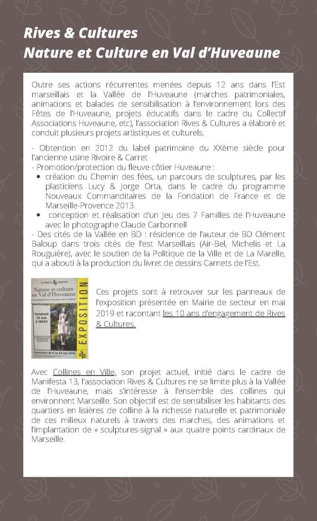 Dans le cadre du projet Collines en Ville, dans l’Est marseillais, Rives & Cultures a tout d’abord proposé des balades à orientation botanique et patrimoniale, mises en place à l’attention des usagers de la Maison pour Tous Vallée de l’Huveaune (MPT).
