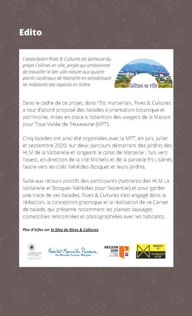 Suite aux retours positifs des participants (habitants des HLM La Valbarelle et Bosquet-Néréides pour l’essentiel) et pour garder une trace de ces balades, Rives & Cultures s’est engagé dans la rédaction, la conception graphique et la réalisation de ce Carnet de balades, qui présente notamment les plantes sauvages comestibles rencontrées et photographiées avec les habitants.
